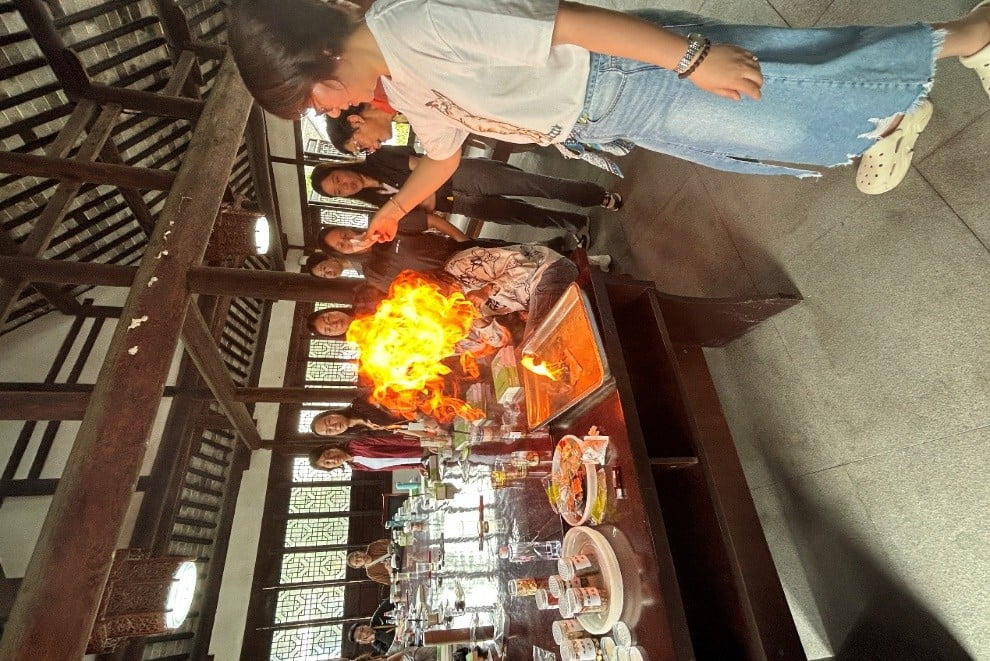 最令同学们印象深刻的,莫过于“海金沙火烧试验”这一教学瞬间。胡主任取出海金沙饮片后点燃,火焰腾起。她解释:“优质海金沙易燃烧,会发生爆鸣声且有明亮的火焰。这是一种传统而实用的真伪辨识方法。” 这一场面令同学们深感震撼,不少人表示:“没想到中药鉴别不仅靠仪器,也可以‘烧’出真伪,传统中药鉴别可以这么有温度、有气味、有判断力。”