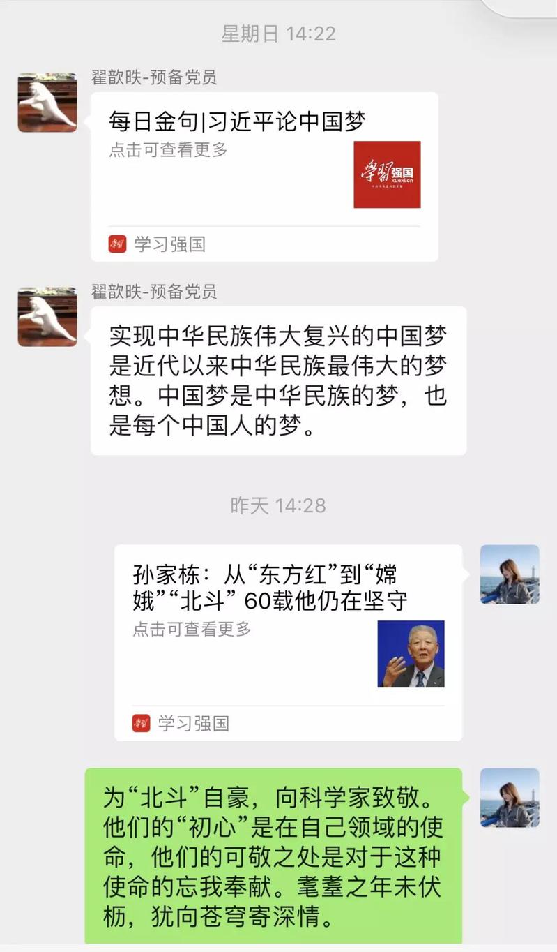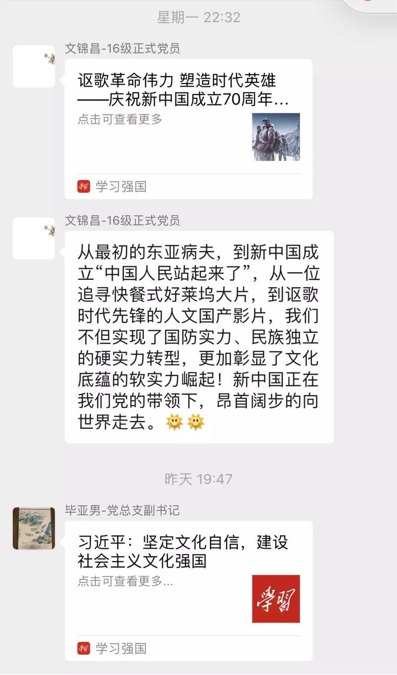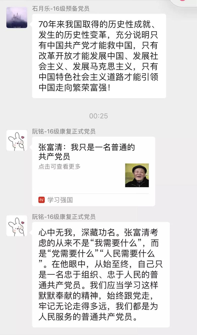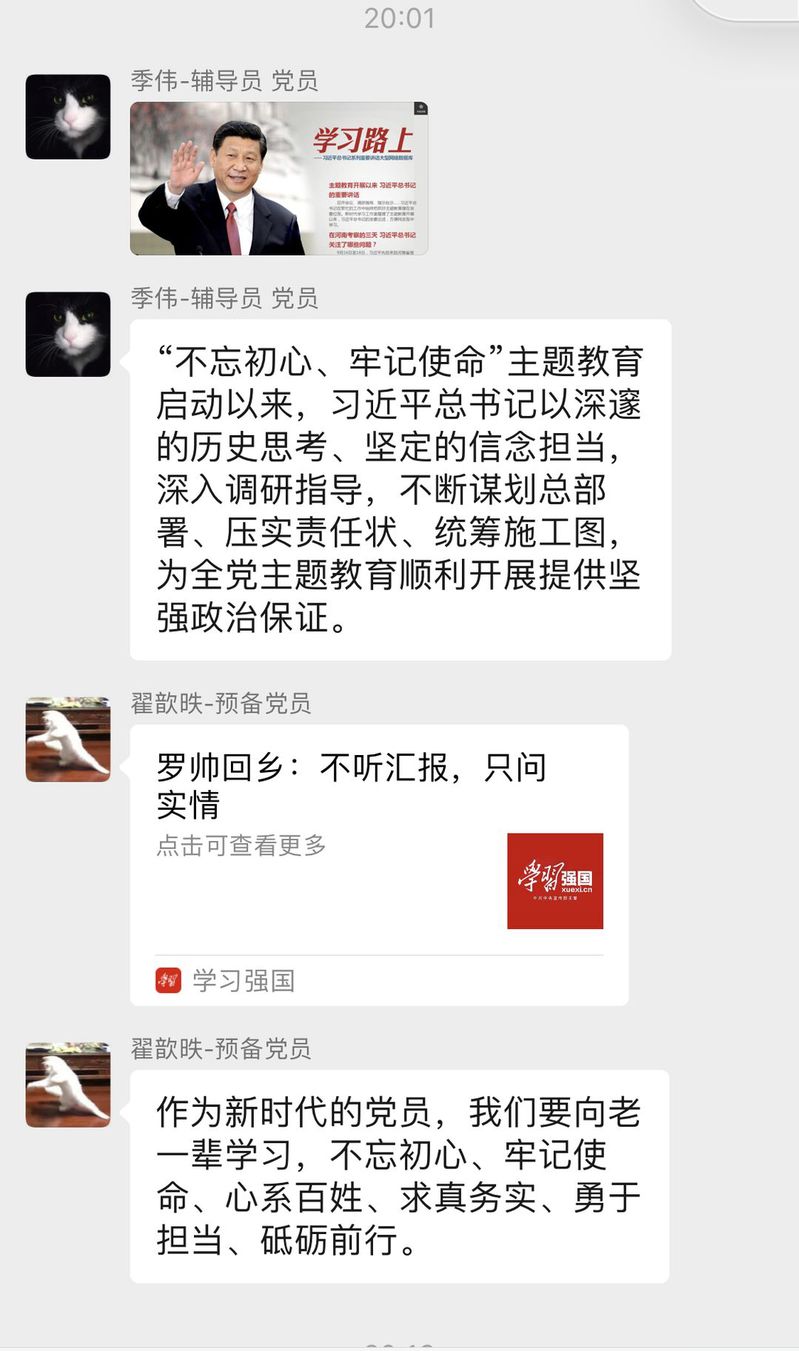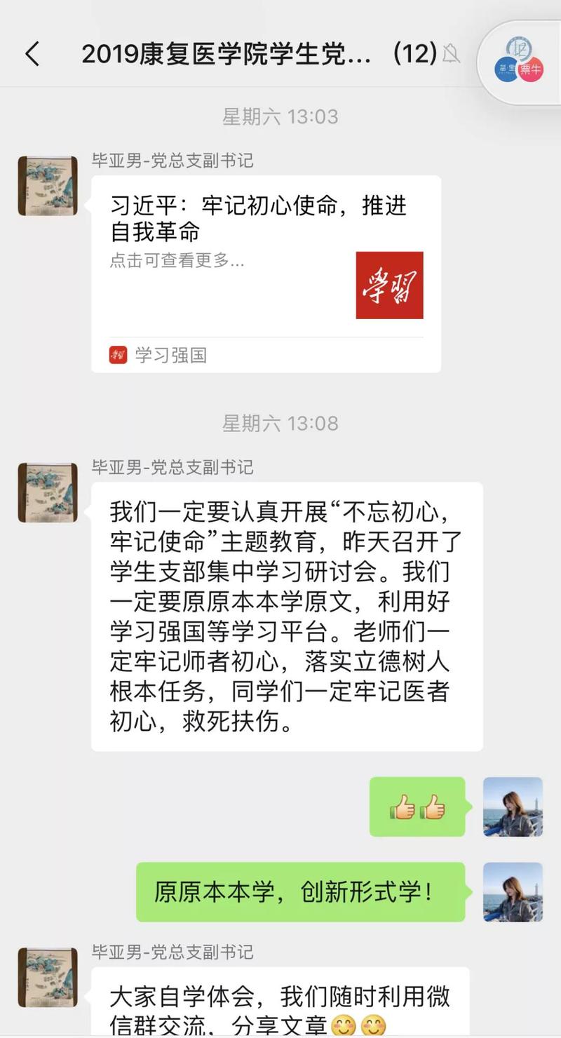 近期,康复医学院学生党支部每一位党员每天自发地在群里分享个人自学《习近平关于“不忘初心、牢记使命”重要论述摘编》、《习近平新时代中国特色社会主义思想学习纲要》等主题教育学习资料的心得体会。