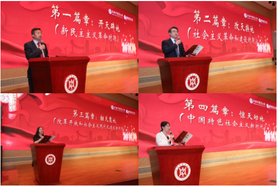 党课在雄壮的国歌中拉开帷幕。大合唱《国际歌》、《没有共产党就没有新中国》、舞蹈《映山红》、小组唱《游击队之歌》、歌舞《红梅赞》、红色歌曲串烧《歌唱祖国》、说唱歌曲《我和我的祖国》、歌曲+诗朗诵《春天的故事》、DISCO舞蹈《路灯下的小姑娘》、舞蹈串烧《追梦青春》、手语表演《送你一朵小红花》等形式新颖、多样的活动令人耳目一新。