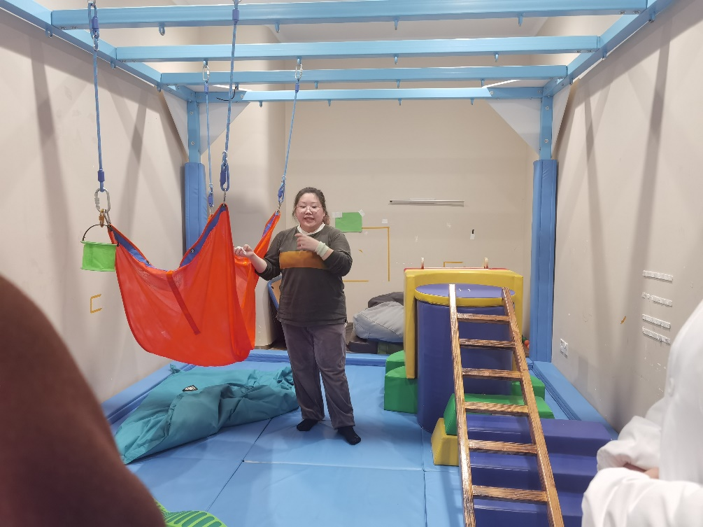 负责人带领我们参观了两个OT治疗室。并且还有学姐为我们简单讲解了这两间治疗室的功能和作用。在后续负责人谈他自己对儿童康复治疗的见解时,其中有两大观点让我记忆深刻甚至有醍醐灌顶的感觉。首先,他提及了关于康复治疗效果的观点。康复治疗是一个长期、缓慢且需要家人高度配合的过程。儿童康复的根本目的是帮助儿童更好地回归社会、适应家庭和学校生活。所以显而易见,要想达到这种效果,康复机构只是一种辅助手段,而家人潜移默化的影响才是主力。他最终总结儿童康复其实更多的是教育家长。我个人认为,他的话无庸置辩,也更新了我对康复治疗这一职业的局限认知。