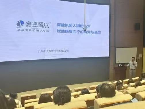 康复医学院导师团院外导师、院级“岐黄育人实践基地”卓道医疗创始人、CEO王道雨为师生作《智能机器人辅助技术在康复治疗中的应用研究与进展》主题讲座。王道雨以自主研发的ArmGuider牵引式上肢康复训练机器人为例,阐述实现了机械臂全面力学交互并配备视听交互情景互动系统的康复机器人模拟再现康复治疗师引导患者进行训练的基本原理,并围绕拥有全球首款实现肩部复合体五自由度设计的机械动力外骨骼结构的Nimbot外骨骼上肢机器人、率先实现髋膝全自由度训练的创新医疗器械SmartSling下肢康复训练机器人,讲解了卓道医疗覆盖上、下肢康复领域完整的康复机器人矩阵。王道雨以直观形式呈现了康复医学工程领域的发展前沿,让同学们领会到康复机器人已经能够提供灵敏、精准的力控方案,构建实时任务导向型情景交互和强大的数据采集、分析、处理系统,这使得以有效治疗和易于管理为优势的康复机器人能够进一步配合乃至嵌入当前康复治疗体系。