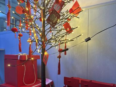 而另一边,同学们正在用吉祥树、彩带、小灯笼等装饰品装点着泽兰苑,整个泽兰苑大厅被装点得如诗如画,充满了祥和与喜庆的氛围。在这温馨的氛围中,同学们感受到了家的温暖与关怀,更加坚定了对未来美好生活的向往与追求。值得一提的是,同学们将生活中闲置的物品摆放在礼物盒中,通过自助的方式进行“以物换物”,促进了彼此之间的互动,使闲置物品得到循环利用。自助交换礼物活动成为新春活动中一道亮丽的风景线,它不仅仅是一个简单的礼物交换,也是同学们心与心的交流,更有助于推动环保和可持续发展。