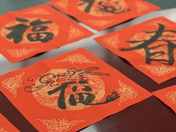 “笔墨迎新年,春联送福至”,活动伊始,书法爱好者们现场挥毫泼墨,为大家展示了对联的书写技巧。同学们跃跃欲试,纷纷写下自己的祝福与期许。一个个生动可爱的“福”跃然纸上,现场弥漫着淡淡的墨香和欢声笑语,同学们沉浸在对传统文化的热爱与追求中,深刻地感受到中华文化的博大精深。