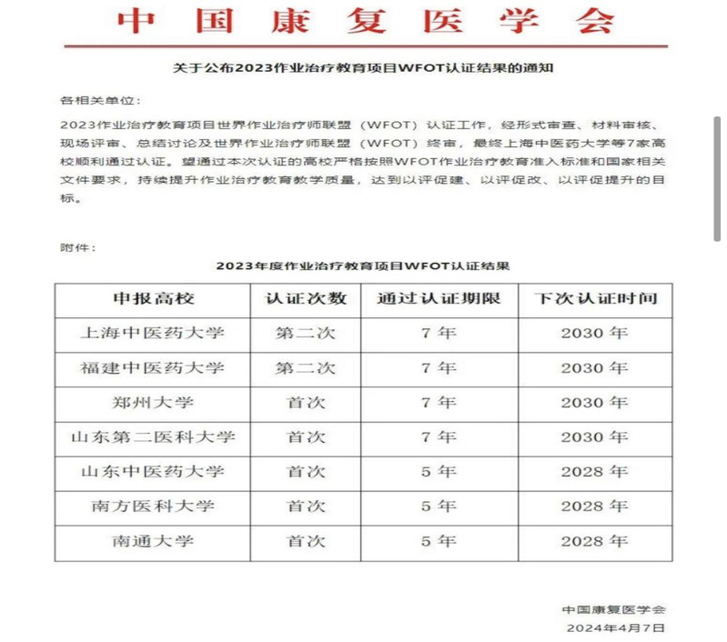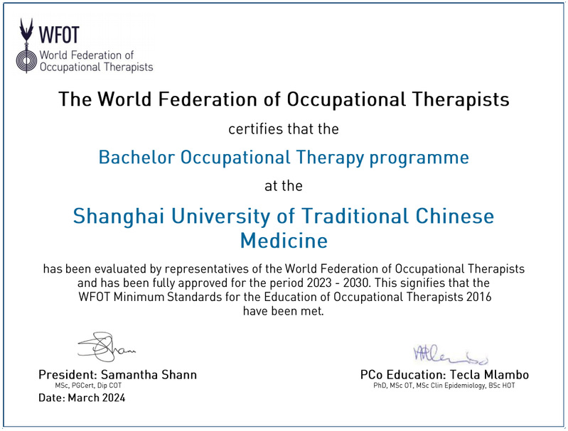 近日,上海中医药大学康复作业治疗专业教育通过世界作业治疗师联盟(The World Federation of Occupational Therapists, WFOT)复审认证,获得了7年最高级别有效认证期。