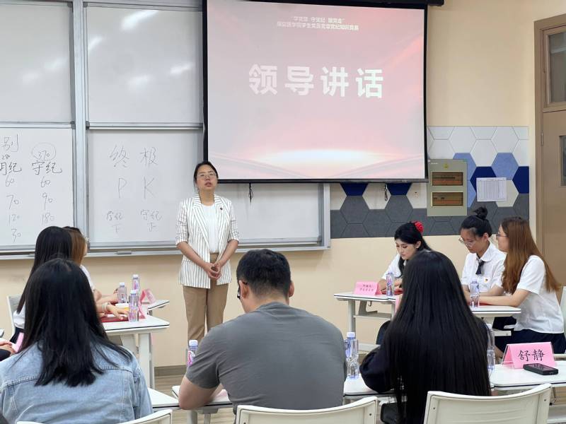 最后舒静副校长发表讲话,提出党的纪律建设是党的建设的永恒课题,是我们党保持先进性和纯洁性的重要保障。在新的历史条件下,加强纪律建设显得尤为重要,这不仅是维护党的团结统一和战斗力的需要,更是推动学校和学院各项事业发展的有力支撑。勉励学生党员应继续加强党纪学习教育,切实增强纪律意识,做到“心中有纪”,深入学习党的纪律和规矩,把纪律和规矩内化于心、外化于行,使之成为自觉遵循的行为准则,以更加昂扬的斗志和更加扎实的作风,为健康中国建设贡献青春力量