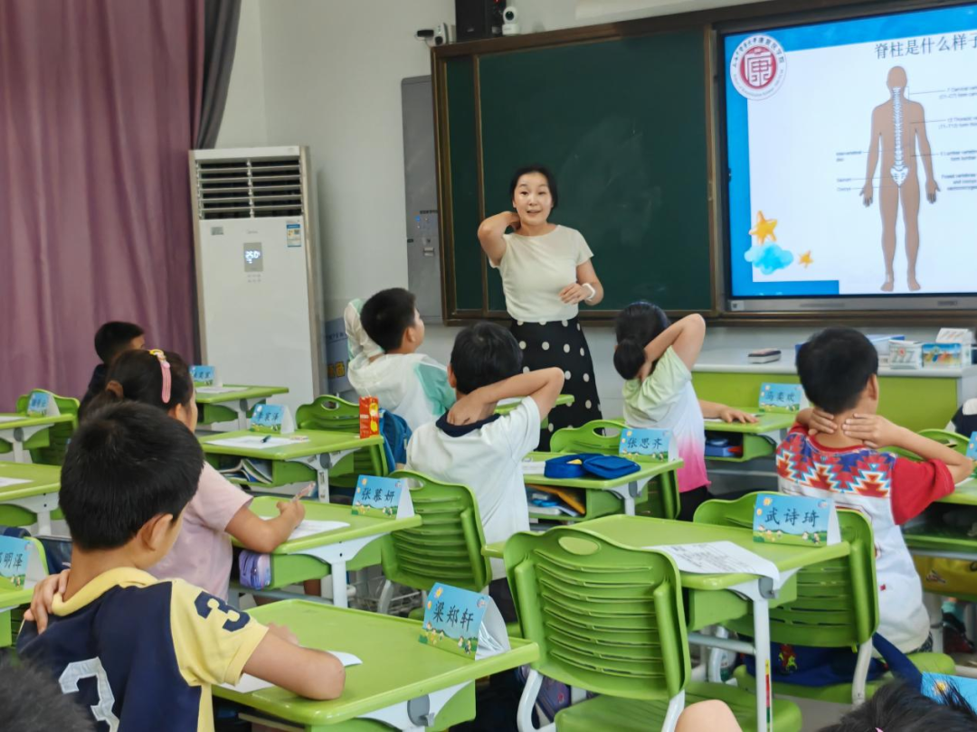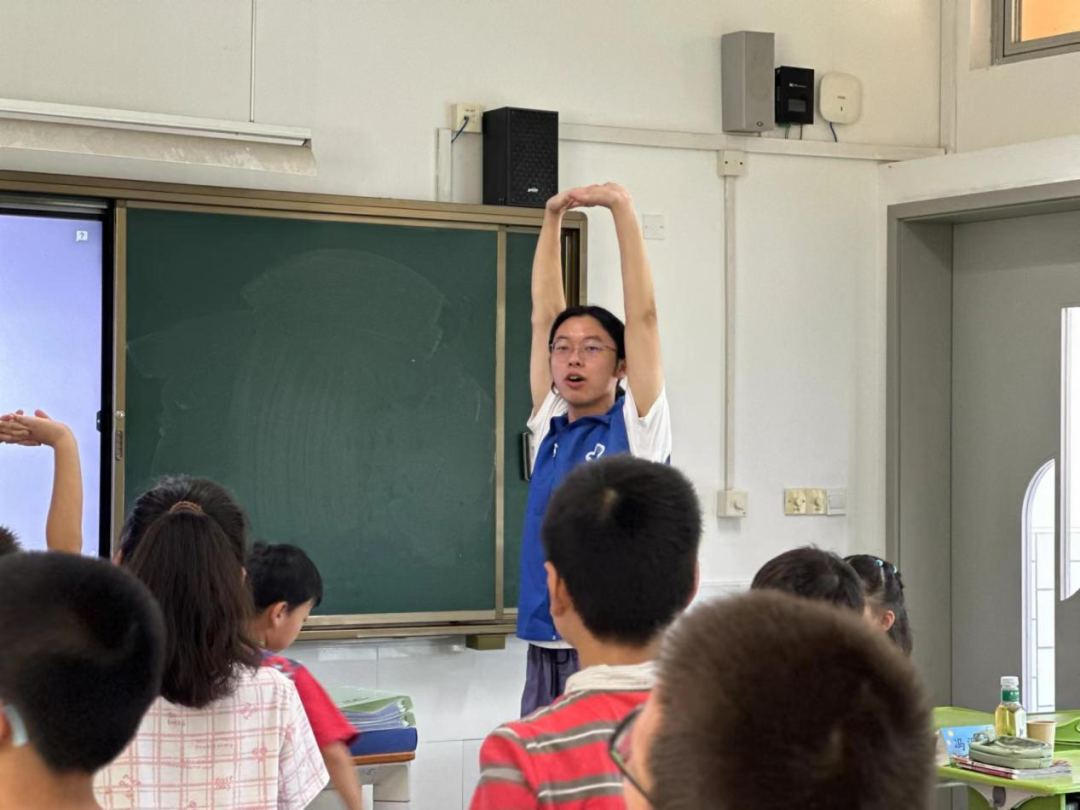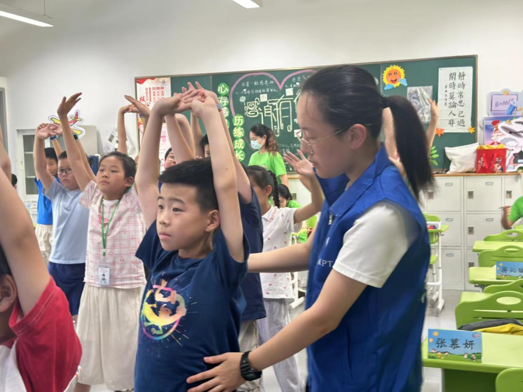 第二周的讲课主要聚焦于八段锦教学,由PT志愿者王逸欣、唐子杰科普八段锦及其功效,并现场指导暑托班儿童进行八段锦学习与锻炼,通过拍摄运动前后的体态评估照片,记录小朋友们八段锦运动前后体态的变化。