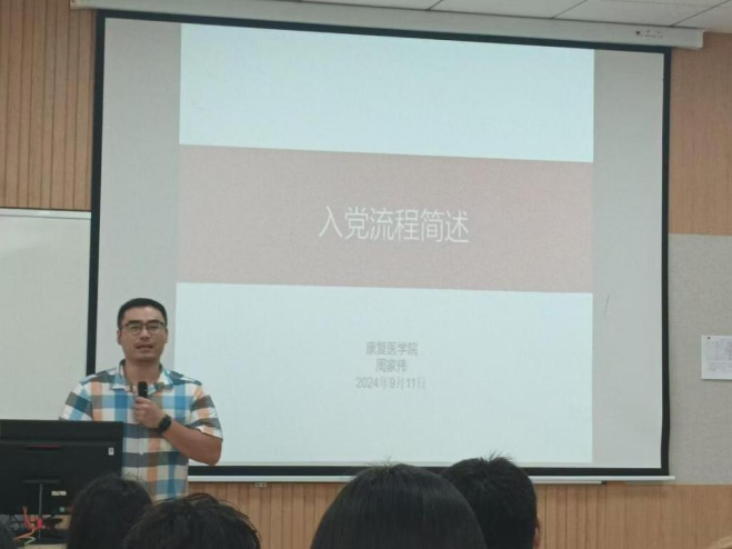 2024911日下午,康复医学院党委书记向延卫在10105教室为2024级新生讲授第一堂党课。康复医学院党委副书记毕亚男、专职组织员周家伟、学生辅导员丁禹洁共同参加学习。