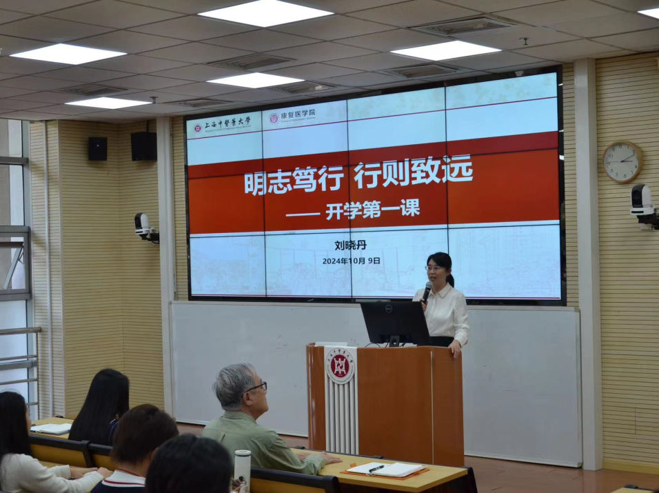 为助力健康中国发展战略,提升康复理念,增强专业认同,我院特开展院长第一课专题讲座,指导新生规划大学生活及职业发展,帮助他们了解并热爱康复医学,引导新生学习康复医学知识,锻炼专业实践技能,承担建设健康中国的历史使命。2024年10月9日,康复医学院院长刘晓丹教授以“明志笃行,行则致远”为主题,为2024级新生呈现了一堂生动而深刻的讲座。