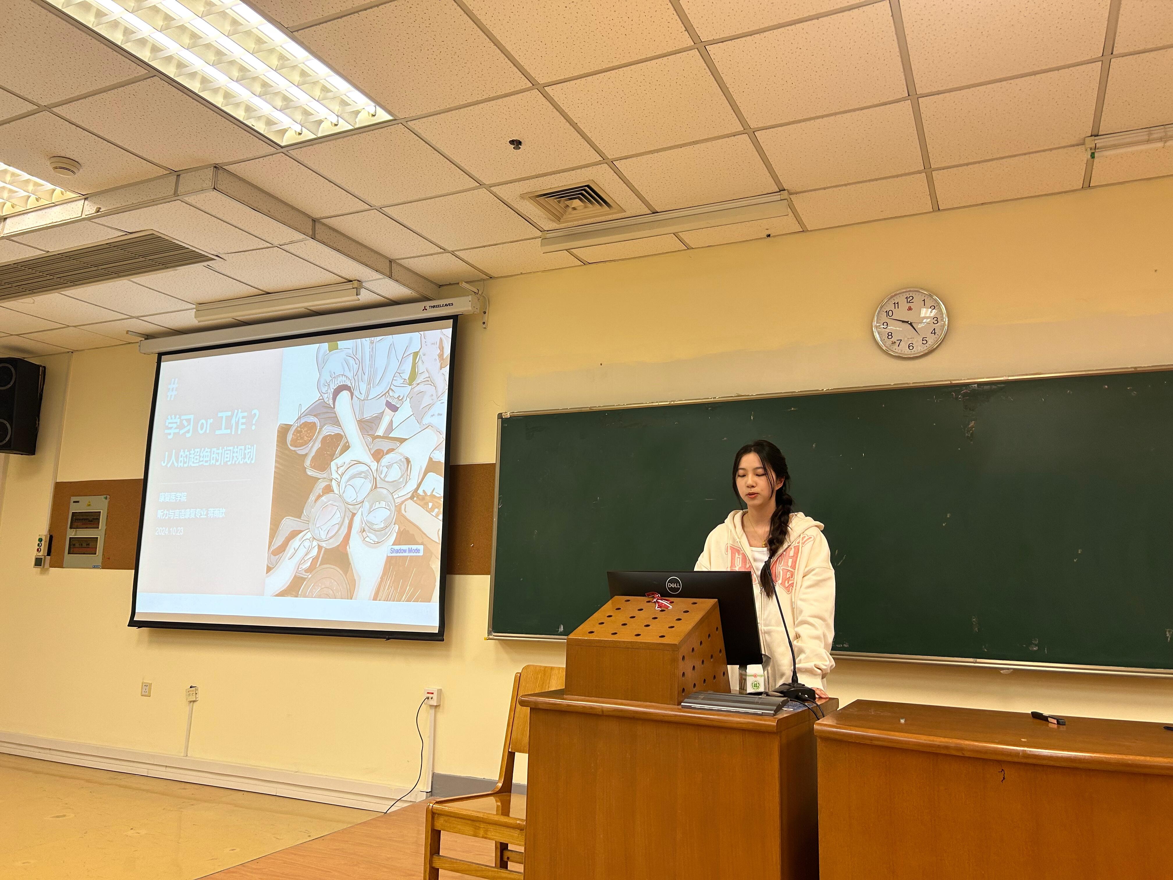 蒋雨歆,目前担任康复医学院团委副书记、2021级听力与言语康复学专业班长。首先,她强调时间规划的重要性,并给同学们展示了自己的课表与计划。她介绍了各项学生工作的小技巧,强调工作的高效性,作为学生骨干也可以提升自我、充分利用时间,实现学习与工作“双赢”。