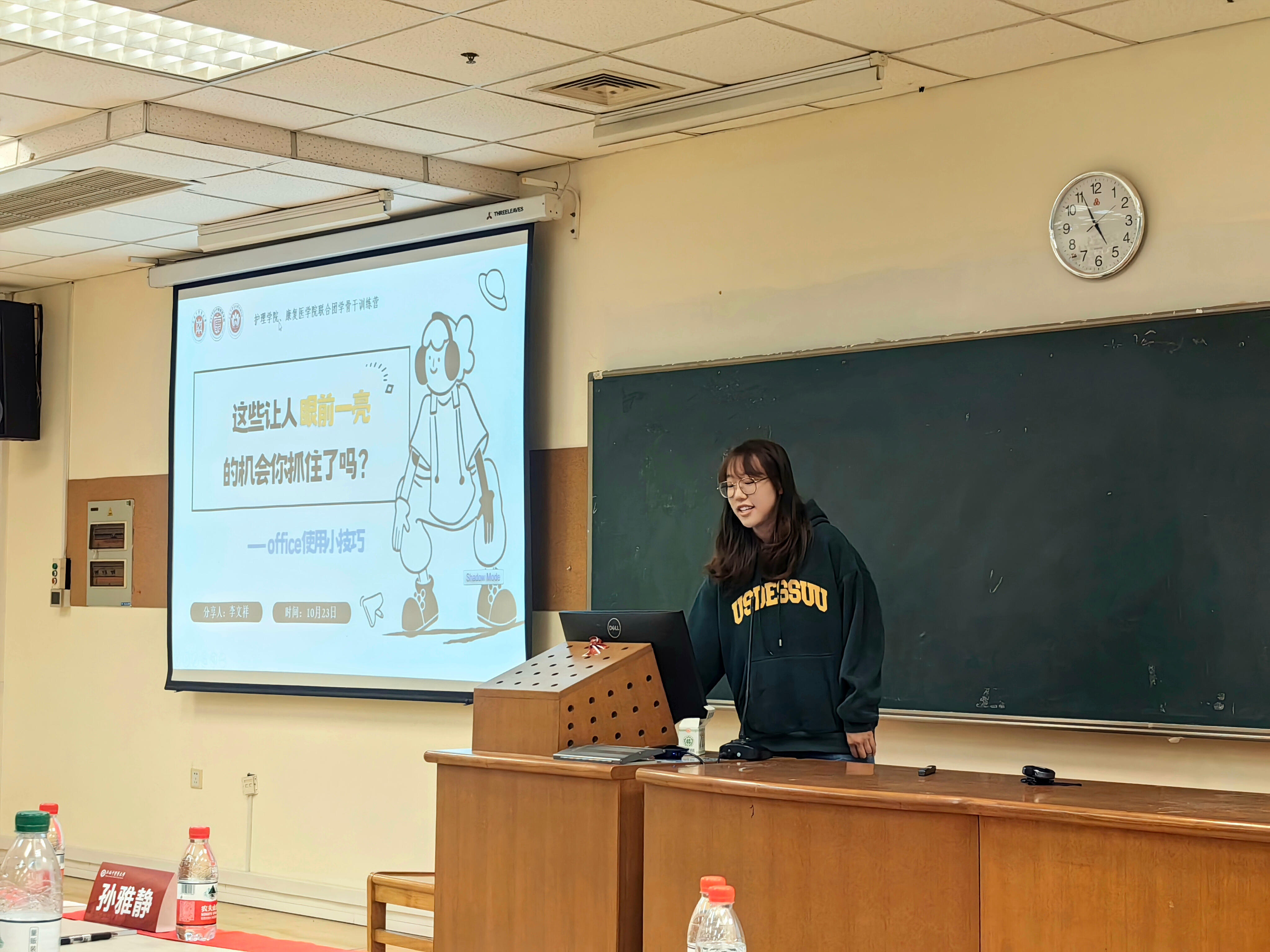李文祥同学是康复医学院第五、六届学生会主席团成员,她提出团学骨干应当“致广大而尽细微”,介绍了office的使用方法,向同学推荐制作PPT的技巧。最后,她与同学们展开交流,答疑解惑。