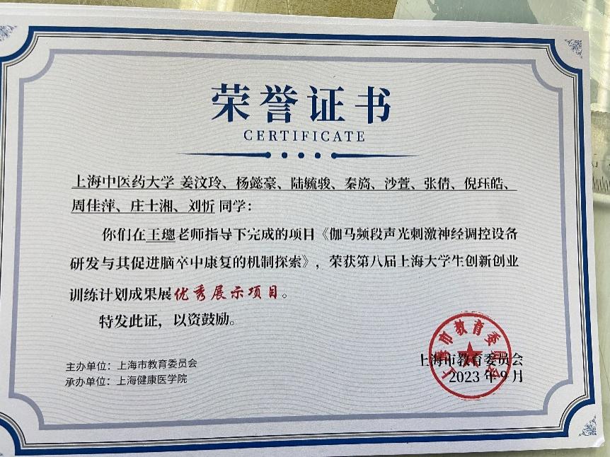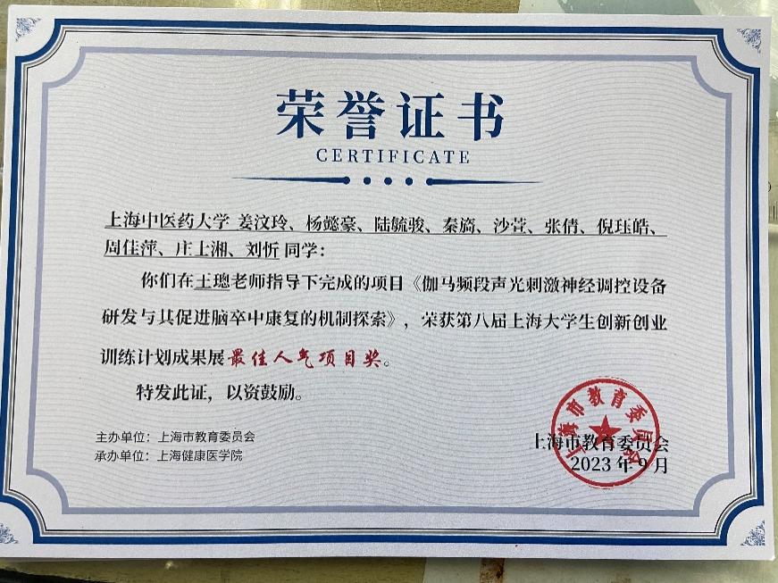 7.第八届上海大学生创新创业训练计划成果展最佳人气项目奖