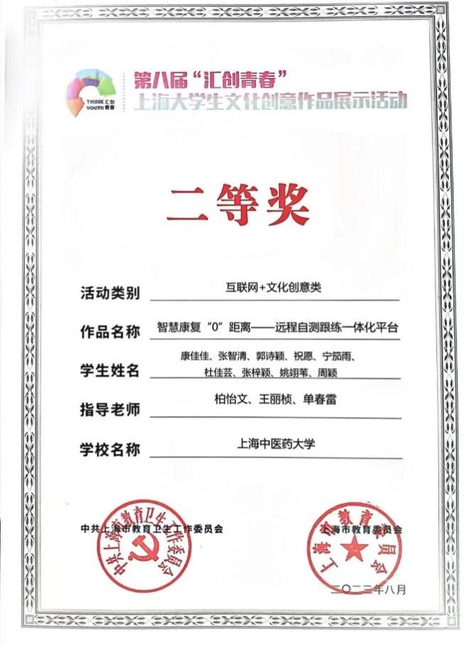 2.第八届“汇创青春”上海大学生文创作品展示活动“互联网+文创类”二等奖