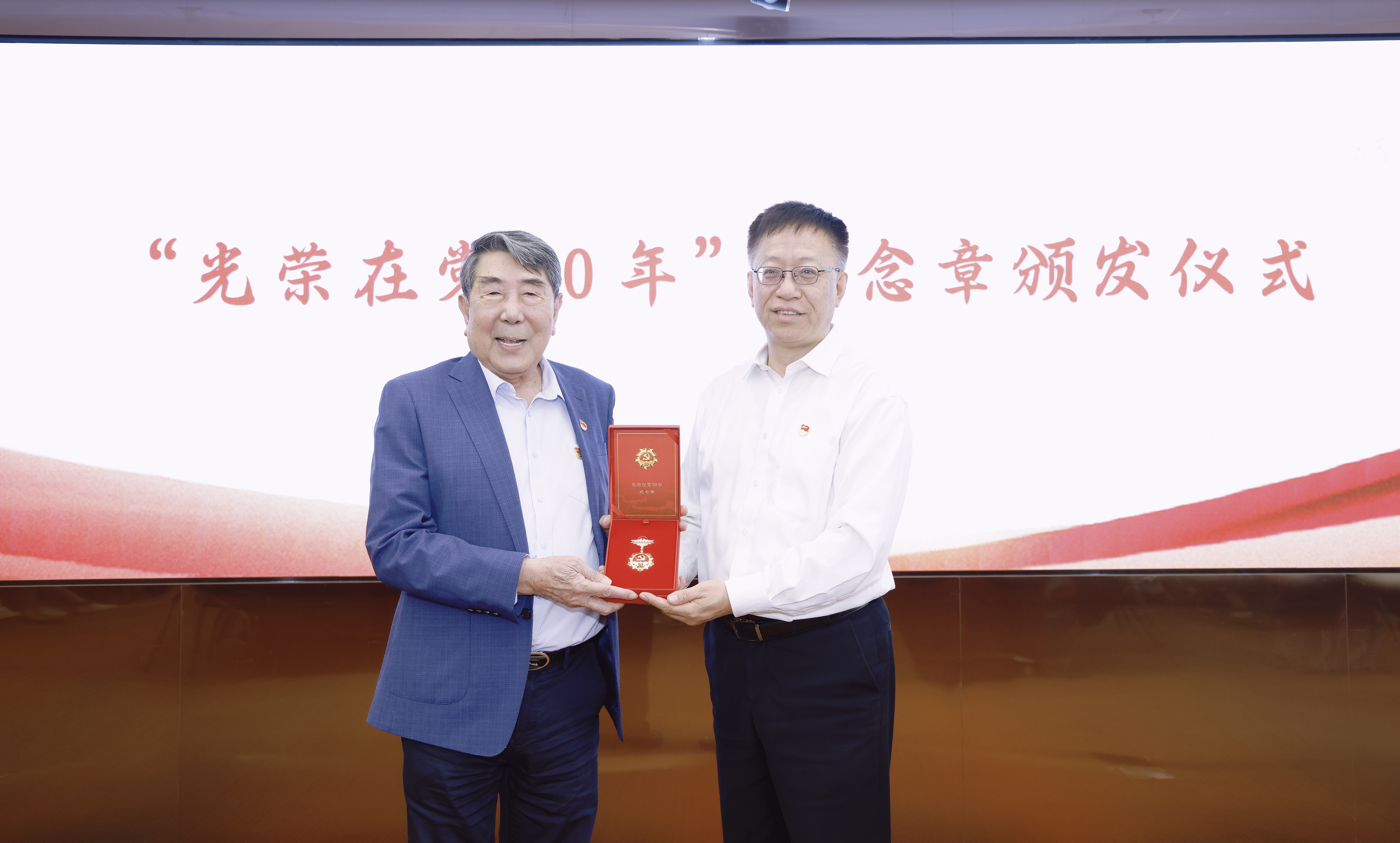 吴志新代表全体师生,为段逸山先生颁发“光荣在党50年”纪念章,2025届毕业生党员代表谭峰浪同学向段老师献花,表达了对段逸山教授的崇高敬意。在建党104周年即将到来之际,段逸山先生带领全体师生党员重温入党誓词,坚定理想信念,不忘初心使命。