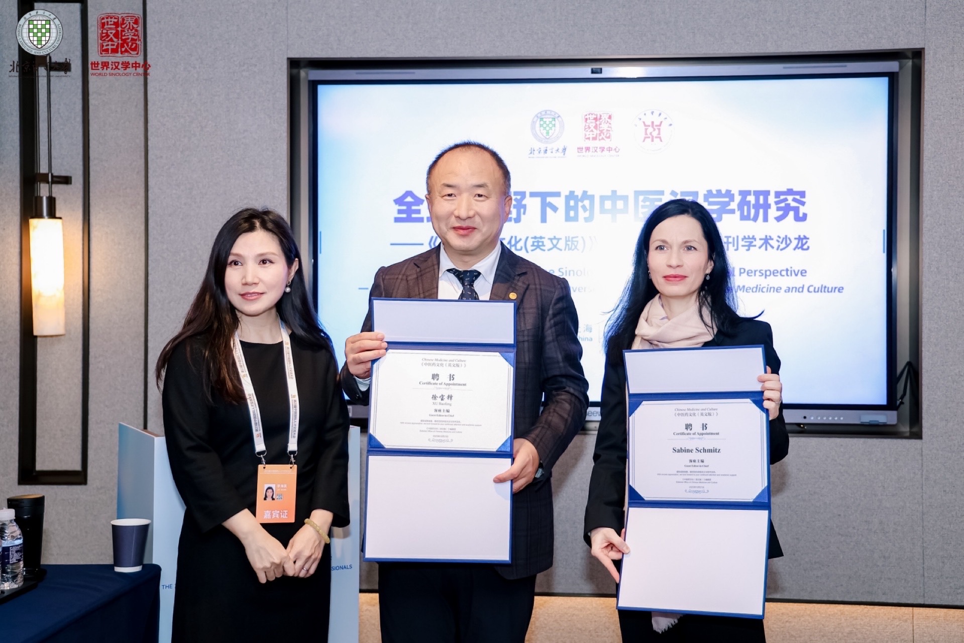 徐宝峰院长与Sabine Schmitz女士受邀担任《中医药文化(英文版)》“海外中医汉学专刊”特邀客座主编。李海英编审为特邀客座主编颁发聘书。