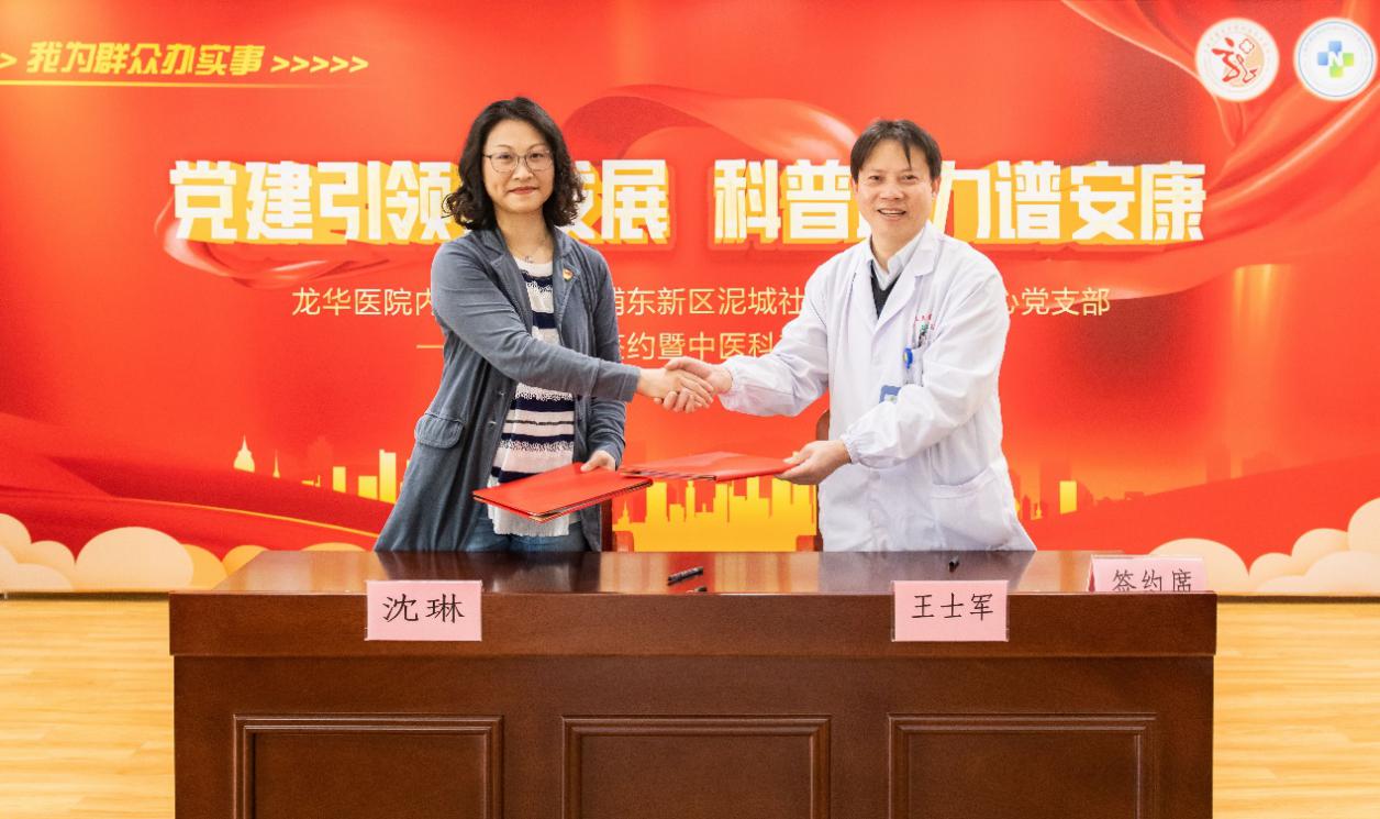 活动伊始,沈琳和泥城社区卫生服务中心党支部书记王士军分别代表双方签订党建共建协议。双方就党史学习教育、优势资源共享、助力基层医疗、定期开展科普义诊等内容进行深入沟通,随后内科第三党支部向泥城社区卫生服务中心党支部赠送由龙华医院林钟香教授和沈琳主编的中医养生保健科普书籍《常见心脑疾病的中医预防和护养》。