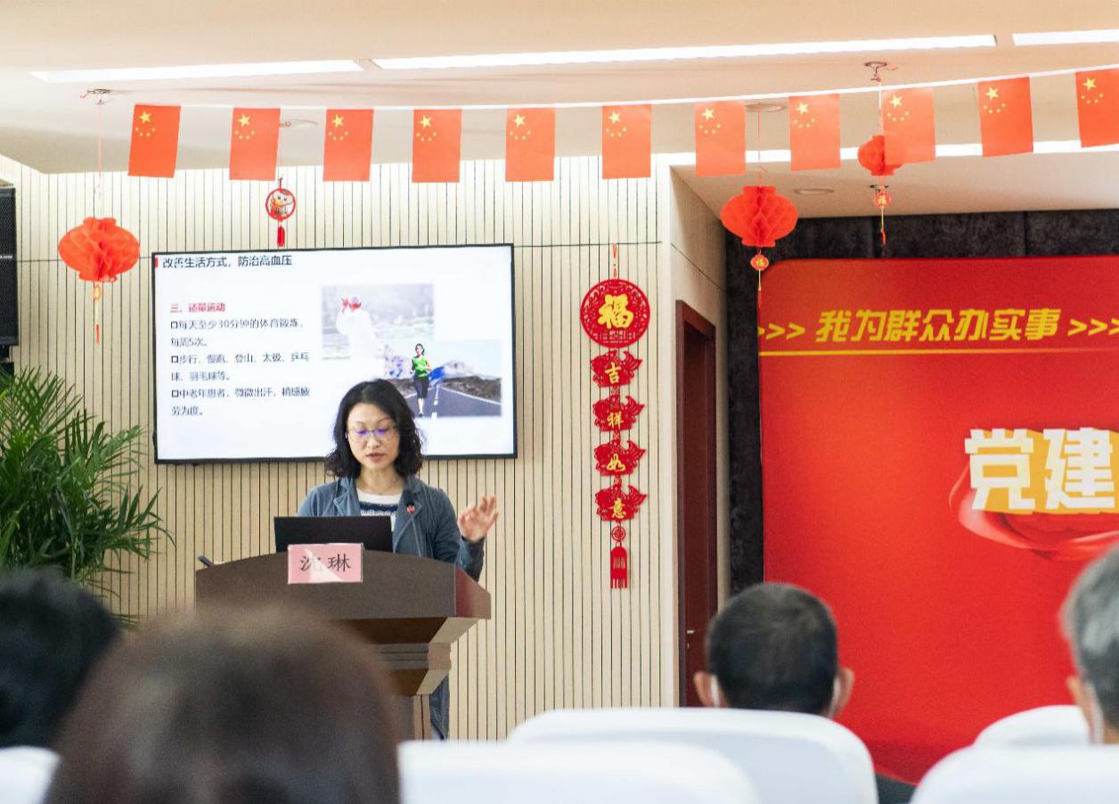 随后,“党建引领促发展,科普助力谱安康”中医科普宣传活动拉开了序幕,泥城居民纷纷来到活动现场,在工作人员引导下有序参与科普学习及健康咨询。沈琳主讲了题为《健康从“心”开始,高血压的防治》的专题科普讲座,宣讲高血压病的中医防治方法。现场居民对高血压的饮食起居中医调摄、保健穴位按摩等有了更深入的认识,并在支部党员们的带领下,共同学习、演练由龙华医院心病科制作的“养心八段锦”中医保健功法。