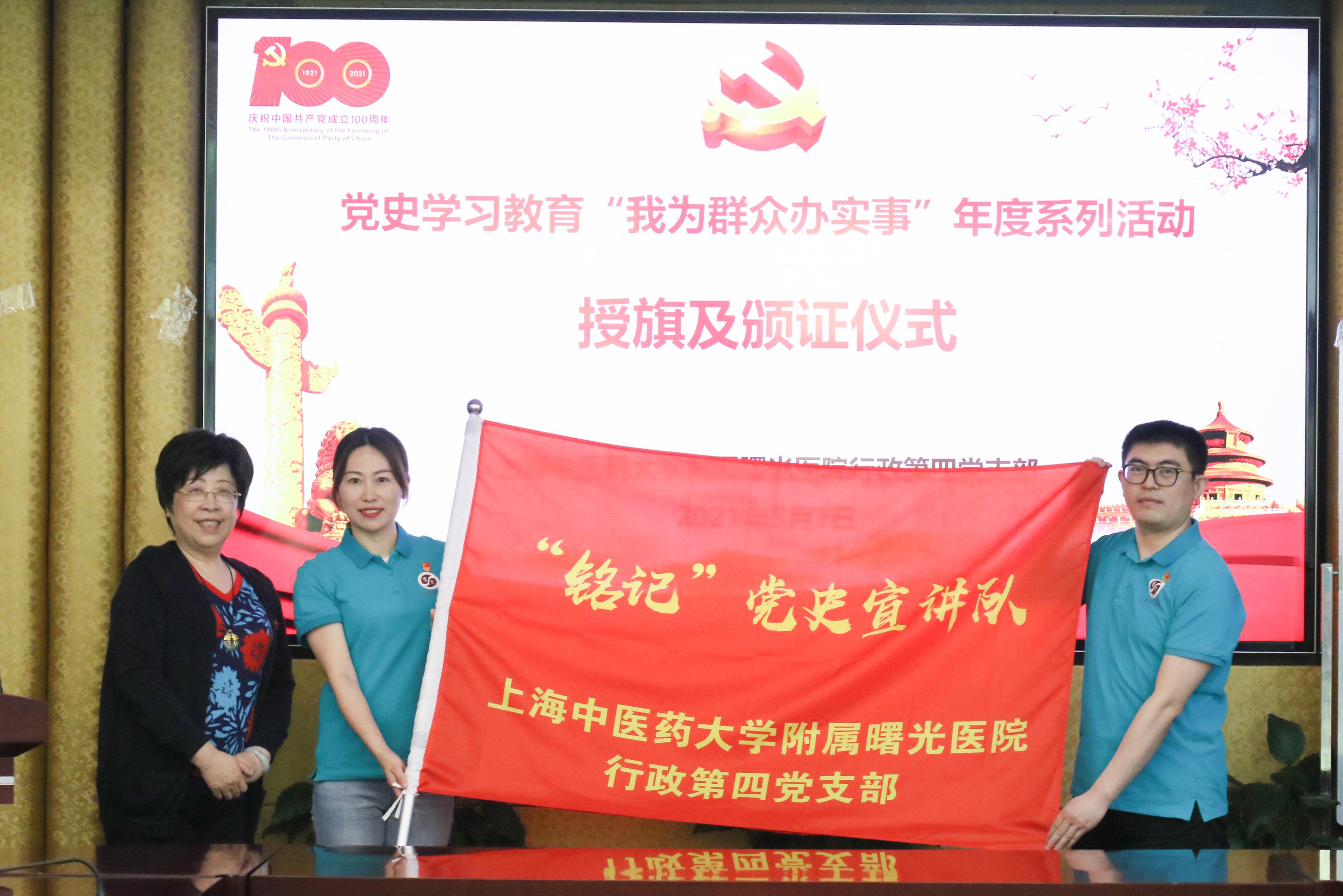 为深入贯彻落实上海中医药大学党委和附属曙光医院党委关于党史学习教育的工作部署,5月7日中午,医院行政第四党支部召开党史学习教育之“我为群众办实事”系列活动授旗及颁证仪式。医院党委书记马俊坚出席。