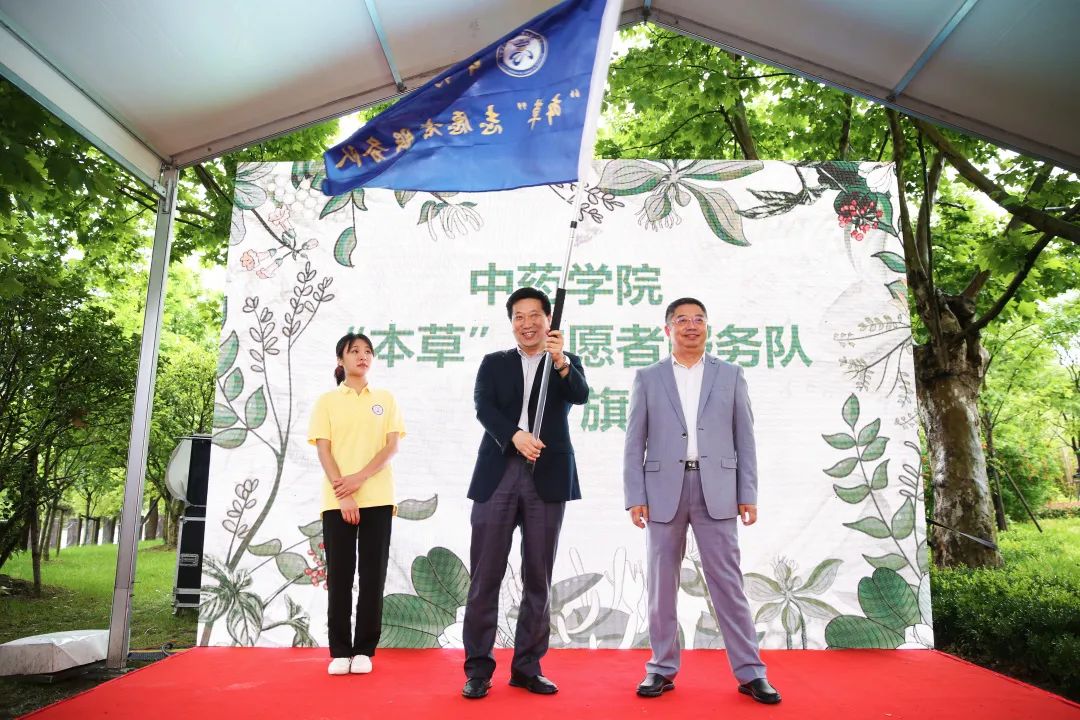 上海中医药大学中药学院成立了百草园师生志愿者服务队,支持与维护好百草园的发展。大学生讲解员今后将为本校师生和市民提供定期讲解服务。张江集团董事张爱平为志愿者服务队授旗。