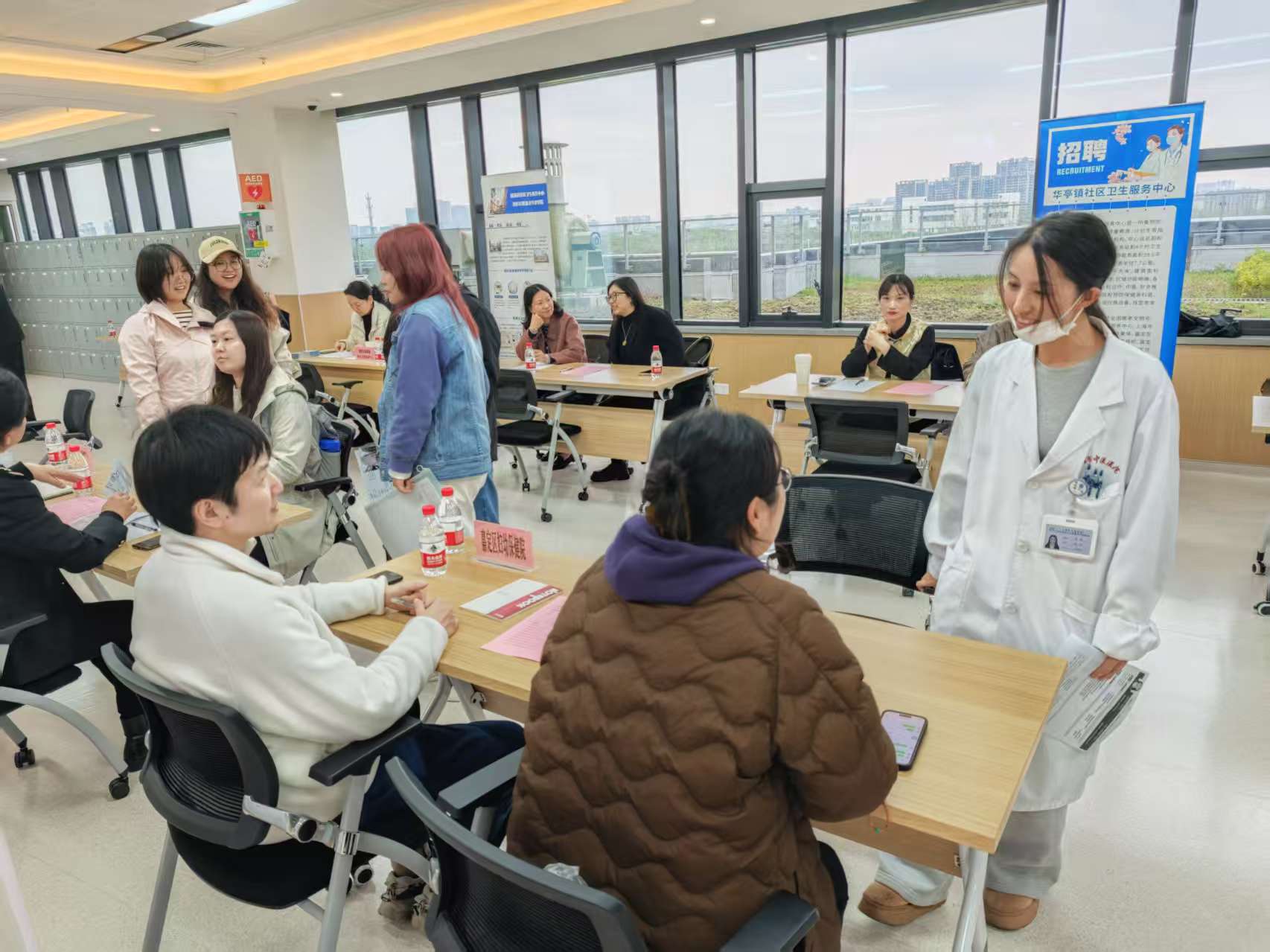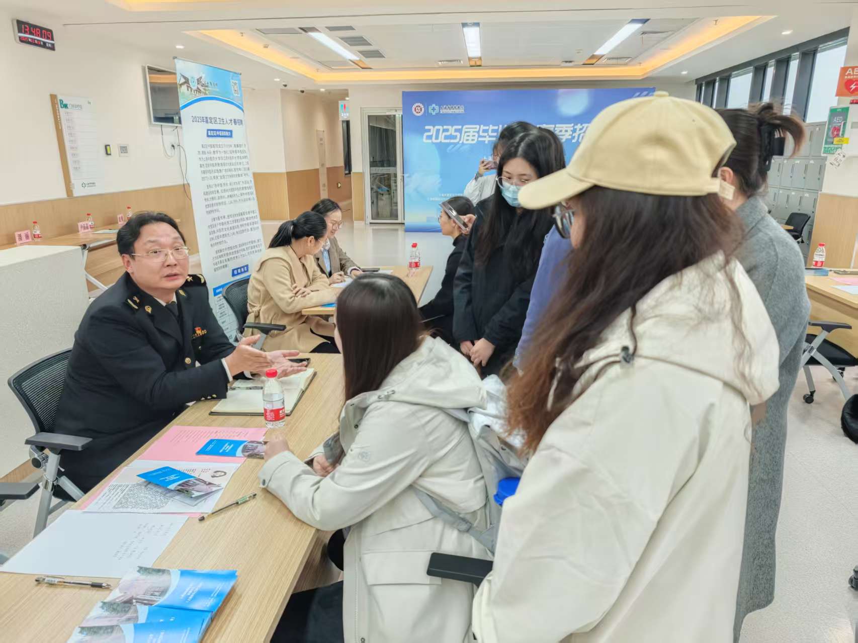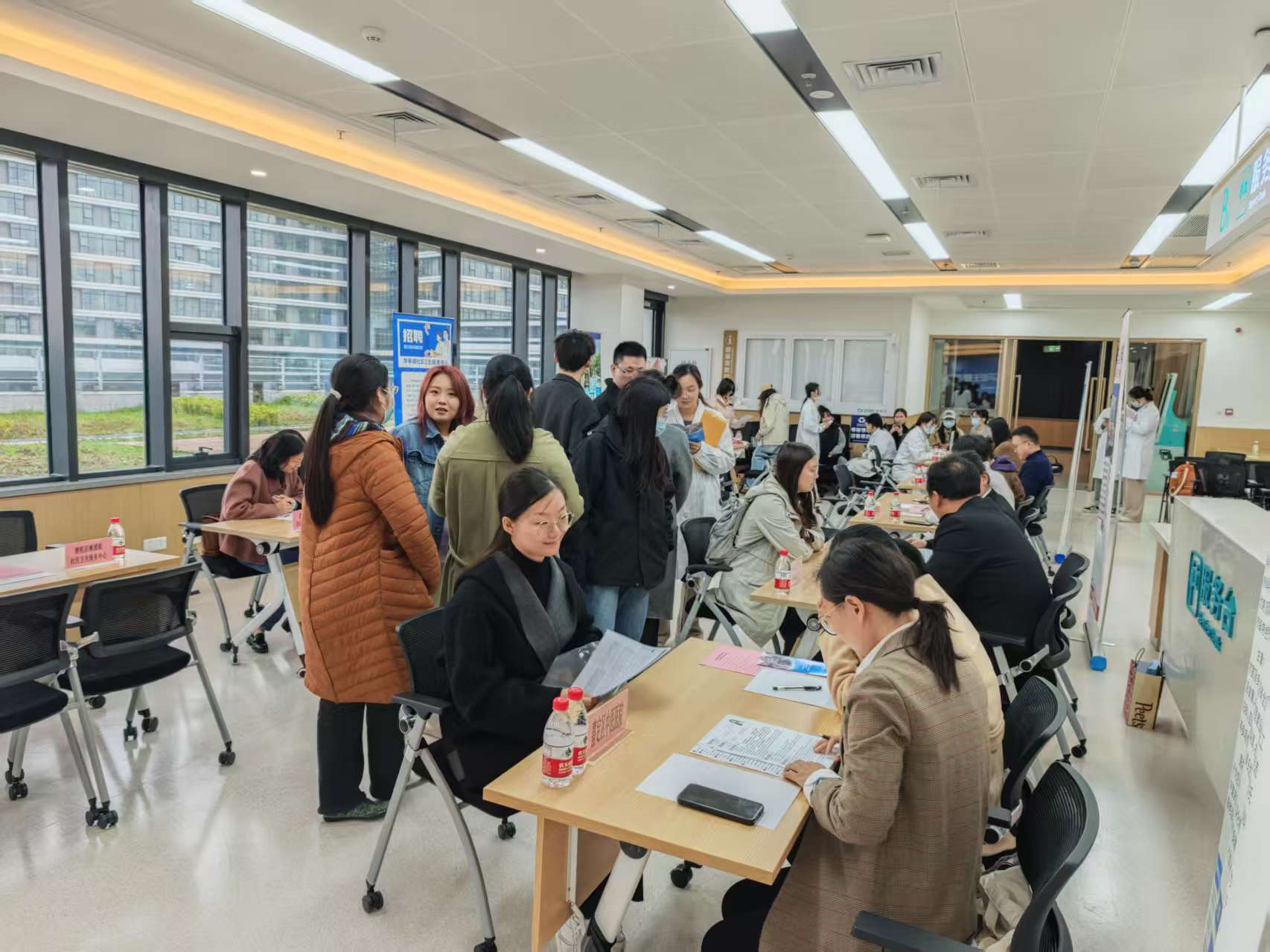 在接下来的现场求职环节中,各医联体单位设有多个招聘单位的展位,为求职学生提供了丰富的岗位选择和咨询服务。学生们纷纷来到展位前,与招聘代表进行面对面交流,了解岗位需求、薪资待遇及职业发展前景等信息。同时,部分单位还安排了初步面试环节,对表现优秀的学生进行了现场考核。