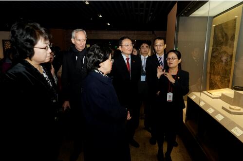 陈冯富珍一行重点参观了中医药博物馆历代医学荟萃展区、中医养生文化展区和近代海上中医展区。在中医药博物馆镇馆之宝——乾隆御制针灸铜人前,陈冯富珍仔细端详,仿佛看到了悠远的中医药历史。在中医药对外交流区,陈冯富珍驻足浏览,了解传统医药与历史丝绸之路的渊源,她说,“中医药作为中国的优秀文化和科学代表,要沿着‘一带一路’传出去。”走过陈莲舫书斋,步入近代海上中医展,陈冯富珍还观赏了海上名医处方,了解中医人创办学校、医院以及中西医汇通情况。陈冯富珍一边倾听徐建光的介绍,一边与大家亲切交流。