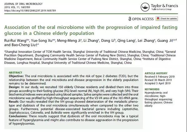 本研究发现,故当空腹血糖过高时,口腔菌群结构也会出现明显失调。口腔菌群失调可作为糖尿病发病过程中的一个典型特征,有可能成为糖尿病发展中的分子标记物。口腔健康在糖尿病防治中的作用值得重视,本研究为将来针对糖尿病患者开发有针对性的口腔护理产品提供基础。该研究《Association of the oral microbiome with the progression of impaired fasting glucose in a Chinese elderly population》已与2019年4月发表在 Journal of Oral microbiology(IF 4.44)上。