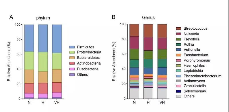 图三 不同分组在门(A)和属(B)水平的的口腔菌群结构