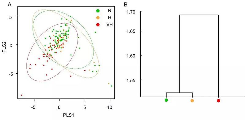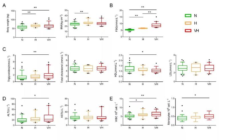 通过与上海市浦东新区张江社区卫生服务中心和上海市浦东新区北蔡社区卫生服务中心合作,我们共招募了150名上海常住老年人,按照空腹血糖水平分为3组,分别为正常组(N),高血糖组 (H),极高血糖组 (VH)。