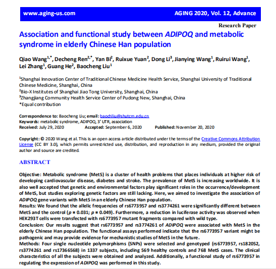 11月20日,上海中医健康服务协同创新中心王侨硕士与上海交通大学Bio-x中心任德成博士为共同第一作者在美国老年病学杂志《Aging》(IF4.83),发表了题为“Association and functional study between ADIPOQ and Metabolic Syndrome in elderly Chinese Han population”的研究论文,该论文是在上海中医健康服务协同创新中心刘保成团队和上海交通大学贺光教授团队的共同指导、联合攻关下,完成研究工作和论文撰写的。