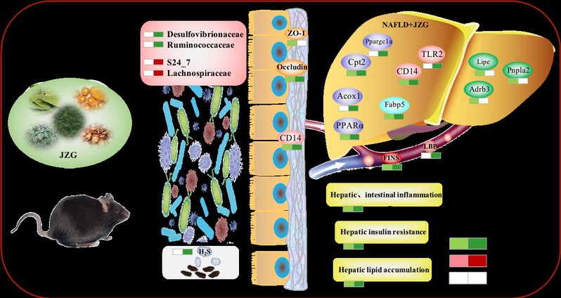 团队研究发现,JZG低、高剂量(LJZ、HJZ)均能改善NAFLD小鼠的肝脂肪变性、肝功能及胰岛素抵抗。16S rRNA基因测序结果显示,JZG治疗可逆转NAFLD小鼠肠道菌群失调,并呈现剂量依赖性作用。HJZ显著降低了Desulfovibrionaceae相对丰度,提高S24_7和Lachnospiraceae的相对丰度。PICRUSt分析结果表明,HJZ可以显著改变肠道菌群功能,包括降低肠道内脂多糖生物合成和硫代谢途径,并与粪便中硫化氢(H2S)和血清中的脂多糖结合蛋白(LBP)水平的检测结果相一致。此外,肝mRNA测序结果进一步表明,HJZ组可调控过氧化物酶体增殖物激活受体(PPAR)通路和炎症信号通路,并进一步通过RT-PCR和Western blot的结果得到验证。团队研究还发现,不同剂量JZG可能通过不同途径调节脂质代谢,LJZ主要通过促进肝脏脂质水解,而HJZ主要通过改善肝脏脂质氧化。综上所述,JZG可通过剂量效应调节肠道菌群失调,减轻炎症水平,调节肝脏脂质代谢,进而改善NAFLD。本研究以肠道菌群的结构和功能为靶点探讨降脂颗粒防治NAFLD的作用机制,为降脂颗粒的临床应用提供新的理论支持。