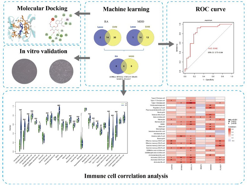 在该项研究中,团队通过两种机器学习的方法,识别出类风湿性关节炎和抑郁症共病的诊断标志物,并分析关键靶点的治疗潜力。研究发现类风湿性关节炎和抑郁症共病可能与6种基因相关(AURKA、BTN3A2、CXCL10、ERAP2、MARCO、PLA2G7),其中部分基因还是首次被报道。该研究在综合应用生物信息学、计算机辅助药物设计、分子生物学实验从多个维度验证了这6种基因的治疗潜力。团队在研究中发现中药活性小分子杜仲苷(Aucubin)可以通过下调PC12细胞中CXCL10和BTN3A2基因表达发挥治疗作用。鉴于此,研究团队通过探究这两种疾病的关联性,提出了新的中药治疗思路和方向,有望为临床治疗提供指导意义。