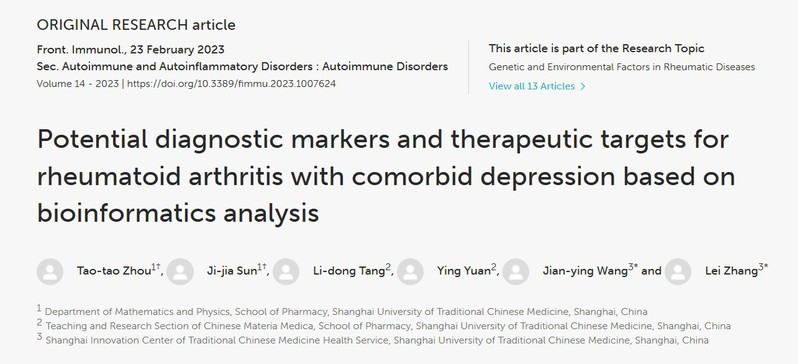 近日,中心张磊慢病组学团队联合中药学院数理团队在类风湿关节炎合并抑郁症的潜在诊断标志物及治疗靶点方面取得了重要进展。该研究成果发表于国际主流期刊Frontiers in Immunology(IF=8.786),题为“Potential diagnostic markers and therapeutic targets for rheumatoid arthritis with comorbid depression based on bioinformatics analysis”。