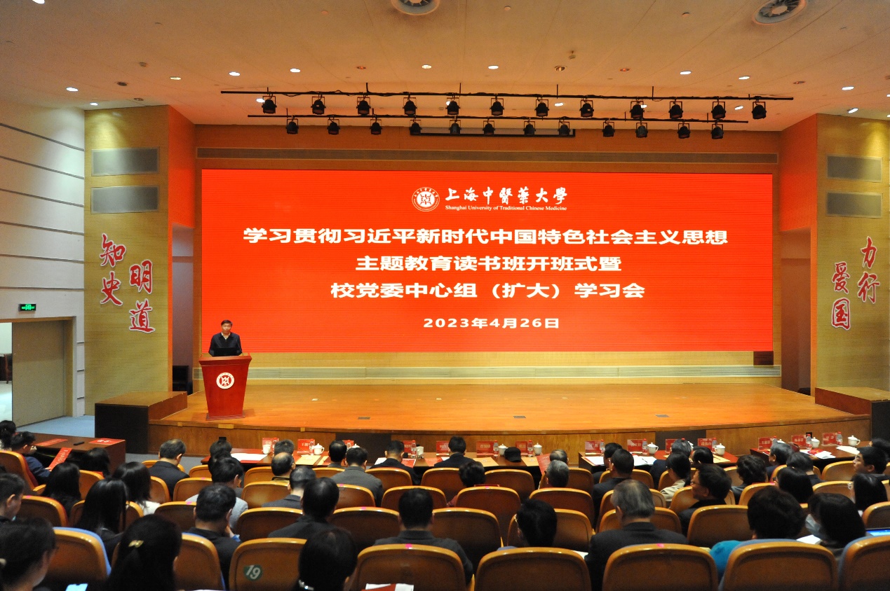 4月26日上午,上海中医药大学学习贯彻习近平新时代中国特色社会主义思想主题教育读书班开班式暨校党委中心组(扩大)学习会在学校图书馆四楼报告厅举行。由上海中医药大学、上海市领导科学学会、上海市马克思主义研究会联合主办的“中华文化和中国精神的时代精华”马克思主义与中华优秀传统文化相结合学术研讨会同期举行。上海市教卫工作党委副书记、市教委副主任闵辉出席会议并致辞。市委第十八巡回指导组专职联络员、市教卫工作党委宣传处副处长张晓飞到会指导。上海中医药大学主题教育领导小组成员,校党委中心组成员,马克思主义学院全体教师,校本部教师党支部书记、青年教师班主任,组织员、辅导员,以及学生党员代表等参加。会议由上海中医药大学党委副书记、副校长朱惠蓉主持。
