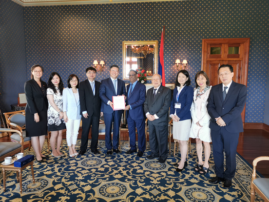 签约仪式结束后,双方受到毛里求斯总统、副总理、商务部部长的亲切接见。周嘉向总统等介绍中医药发展现状、我校及岳阳中西医结合医院特色和优势。他们纷纷表示对“中国-毛里求斯中医中心”的建设大力支持,要让神奇的中医药造福更多毛里求斯民众,相信未来中医药在毛里求斯能够更好地发展。