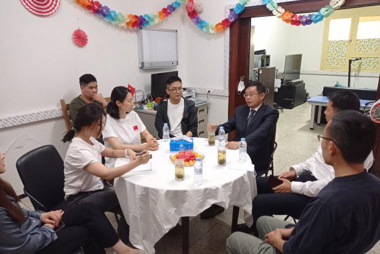 6月3日,驻摩洛哥大使李昌林慰问中国援摩医疗队穆罕默迪耶分队,中国援摩医疗队总队长刘化驰陪同。
