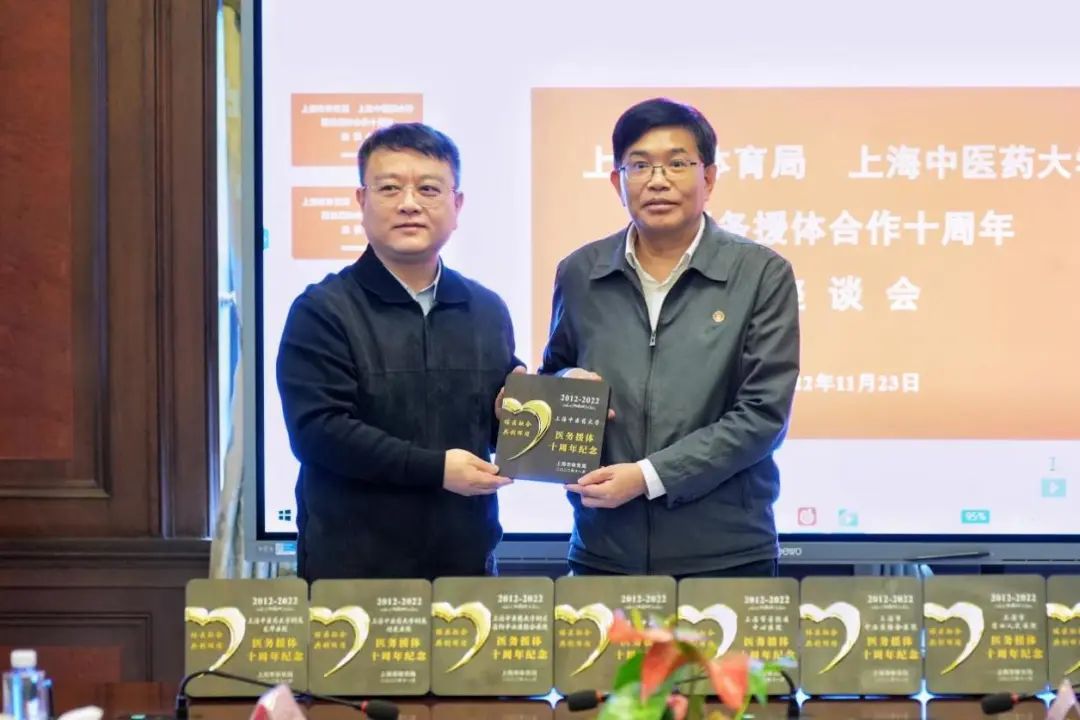 1123日下午,上海中医药大学和上海市体育局举行医务援体合作十周年座谈会,回顾总结双方十年合作历程,共同站在新起点谋划体医合作新篇章。上海市体育局党组书记、局长徐彬,我校党委书记曹锡康、副校长王拥军,医院管理处、党委校长办公室相关负责人,各附属医院分管领导出席。会议由市体育局副局长陆檩主持。