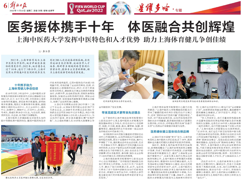 1122日的《解放日报》第6版刊载报道上海市体育局与上海中医药大学十年来携手同行,精诚合作,在各方面取得亮眼成绩。