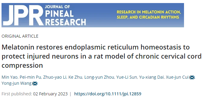 该病由于颈部静态或动态压迫,使脊髓张力和血管供应改变,进而导致缺血、缺氧和血脊髓屏障破坏,最终引起神经元凋亡、脱髓鞘和神经炎症等病理改变,导致脊髓神经功能丧失。内质网应激是内质网稳态的重要组成部分,本项目团队之前的研究中已经在慢性颈髓压迫大鼠模型中观察到,但内质网稳态与CSM的关系尚不清楚。褪黑素是一种公认的抗氧化药物,已被证明对急性脊髓损伤有治疗作用,但其在CSM病理过程中的作用及潜在机制仍不清楚。