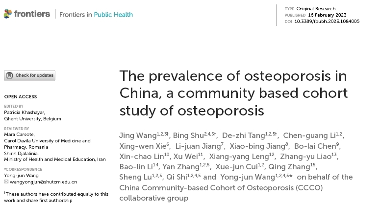 近日,我校脊柱病研究所研究团队联合全国11家单位在《公共卫生前沿》(Frontiers in Public Health)发表题为The prevalence of osteoporosis in China, a community based cohort study of osteoporosis的研究文章。王晶副研究员、舒冰研究员、唐德志研究员为该论文共同第一作者,王拥军教授为通讯作者。上海中医药大学附属龙华医院为论文第一作者单位。