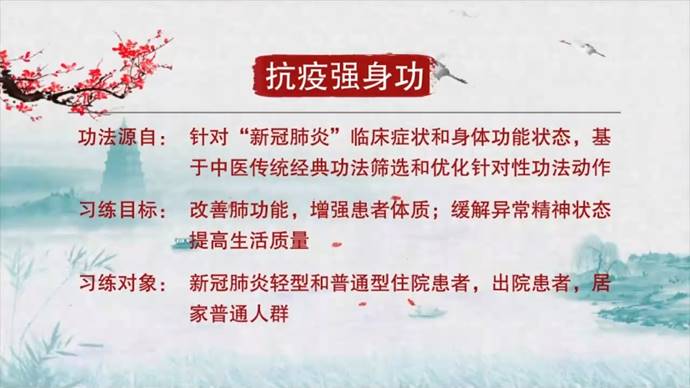 2020年新冠爆发初期,房敏教授团队第一时间制作了“抗疫强身功”。将功法锻炼资料及时发放到武汉雷神山医院、湖北黄石市中医医院、湖北六七二中西医骨科医院等多家医疗机构,指导患者锻炼;并在国内外抗疫实践中推广使用,受益人数超过50万。“抗疫强身功”应用方案被WHO收录,并于COVID-19 / Global literature on coronavirus disease进行了网络首发。