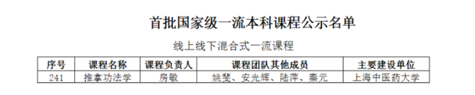 教育部近日公示首批国家级一流本科课程认定结果,上海中医药大学针灸推拿学院房敏教授领衔的《推拿功法学》入围“线上线下混合式一流课程”、针推文献教研室徐平教授领衔的《针灸医籍选读》入围“线上一流课程”。