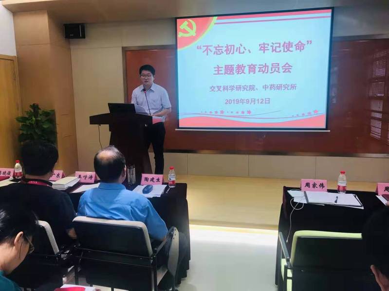 9月12日下午,中药研究所、交叉科学研究院“不忘初心、牢记使命”主题教育动员会在5号楼5101会议室举行。校主题教育第一指导组组长陶建生同志作指导讲话,指导组成员周家伟同志出席会议。交叉科学院总支书记周强代表两个部门作动员讲话,所总支书记、副所长王广东代表研究所作表态发言。我所与交叉科学研究院领导班子、总支委员、支部书记参加会议。