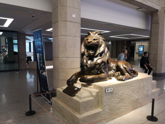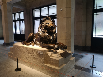 走进一楼序厅,首先映入眼帘的是LED大显示屏,滚动播放短片《上海简史》,作为基本陈列的总起和上海历史概要。侧面有一长列巨大的多媒体互动数字展墙。触摸数字展墙,参观者即可看到唐宋元明清以来上海的海岸演变、市镇分布、水系变化等。从指尖上了解上海的前世今生。另外值得一提的是序厅中的镇馆之宝——两尊铜狮,这是1923年上海汇丰银行大楼建造时向英国订购的两尊青铜狮,一尊嘶吼状,一尊静卧状,其惟妙惟肖的神情及精湛的工艺,令人叹为观止。