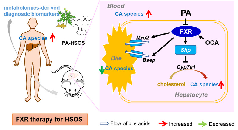 中草药引起的药源性肝损伤近年来成为国内外关注的热点问题。中药安全用药窗口及毒性作用靶标机制不清,严重限制了其现代化国际化应用。在目前所报道的中草药引起的药物性肝损伤中,千里光、菊三七中所含有的吡咯里西啶生物碱(pyrrolizidine alkaloids,PAs)引起的肝窦阻塞综合征(hepatic sinusoidal obstruction syndrome,HSOS)首当其冲,也是与其它药源性肝损伤区别最显著的病症,引起了世界范围内的持续关注。该团队前期对含有PAs的中草药进行了系统的资源调查、化学成分、代谢及毒性评价研究,并通过代谢组学、基因组学、蛋白组学等系统生物学手段对PAs的肝毒性作用机制进行了探讨(Archi Toxicol,Food Chem Toxicol,Chem Biol Interact,Phytochemistry,Acta Pharmacol Sin等),发现HSOS为肝实质细胞损伤与胆汁淤积造成的混合性肝损伤,然而目前国内外对HSOS致胆汁淤积的研究较少。该研究进一步从真实世界菊三七致HSOS的临床样本分析入手,发现HSOS患者初级胆汁酸合成通路异常,特别是血清胆酸及其牛磺酸、甘氨酸结合物异常升高,可有效诊断HSOS(ROC曲线下面积为0.968,95%置信限0.908–0.994,灵敏度83.87%,特异性96.55%)。HSOS患者肝组织胆汁酸代谢调控关键核受体法尼酯X受体(farnesoid X receptor, FXR)的表达显著降低,体外及动物实验提示PAs通过抑制肝脏FXR/SHP通路增强胆汁酸合成造成淤积性肝损伤,而FXR激动剂奥贝胆酸可改善PAs致实验性HSOS,有效降低血清胆酸及其牛磺酸、甘氨酸结合物水平。