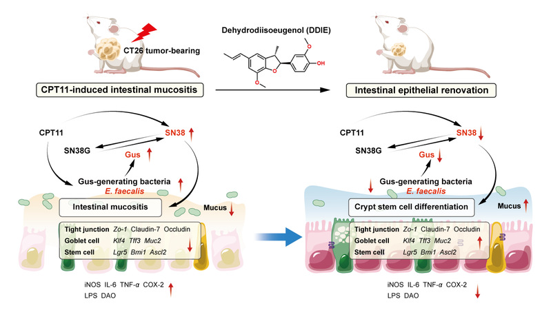 近日,我校中药研究所陈凯先院士、王峥涛教授和窦薇研究员团队在Acta Pharmaceutica Sinica B发表题为Targeted inhibition of Gus-expressing Enterococcus faecalis to promote intestinal stem cell and epithelial renovation contributes to the relief of irinotecan chemotoxicity by dehydrodiisoeugenol的研究论文,揭示了中药肉豆蔻活性成分去氢二异丁香酚在缓解伊利替康化疗肠毒性中的积极疗效,提出“Gus表达细菌-宿主-伊立替康轴”作为减轻化疗消化道副反应的药物研发新策略。