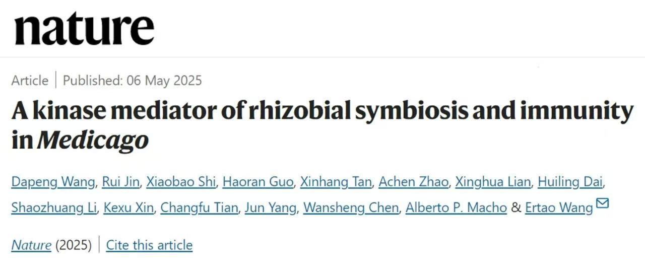 北京时间2025年5月6日,中药研究所青年教师金蕊博士以共同第一作者在国际顶级期刊《自然》(Nature)在线发表了题为“A kinase mediator of rhizobial symbiosis and immunity inMedicago”的研究论文,揭示了细胞质类受体激酶MtLICK1和MtLICK2在豆科植物与根瘤菌共生信号转导和免疫调控中的双重功能,为共生与免疫平衡机制研究提供新视角。