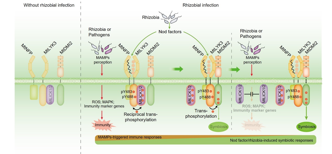 该研究的突破性发现在于首次揭示了细胞质类受体激酶MtLICK1/2在“共生-免疫”调控中的双重功能。一方面,MtLICK1/2通过特异性激活结瘤因子受体复合体,精确传递共生信号;另一方面,该蛋白能特异抑制植物免疫应答。这种“一手促共生、一手控免疫”的精妙调控机制,完美诠释了豆科植物如何实现共生与防御的动态平衡。